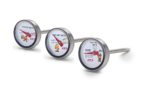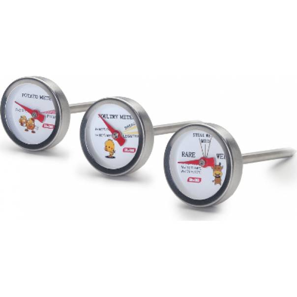 Teploměry můžete používat přímo v troubě (do teploty 120°C), nebo je použít pro zjištění teploty po dopečení. Místo teplotní stupnice jsou na teploměrech úrovně propečení. U teploměru do masa je to rare (krvavý), medium (středně propečený), a well done (propečený), u teploměru do drůbeže najdete rozdílné stupnice na drůbeží prsa a stehna, a třetí teploměr do brambor indikuje, kdy je brambora dopečená. Teploměry jsou vyrobené z nerezu. Délka sondy je 7 cm, průměr 2,5 cm.