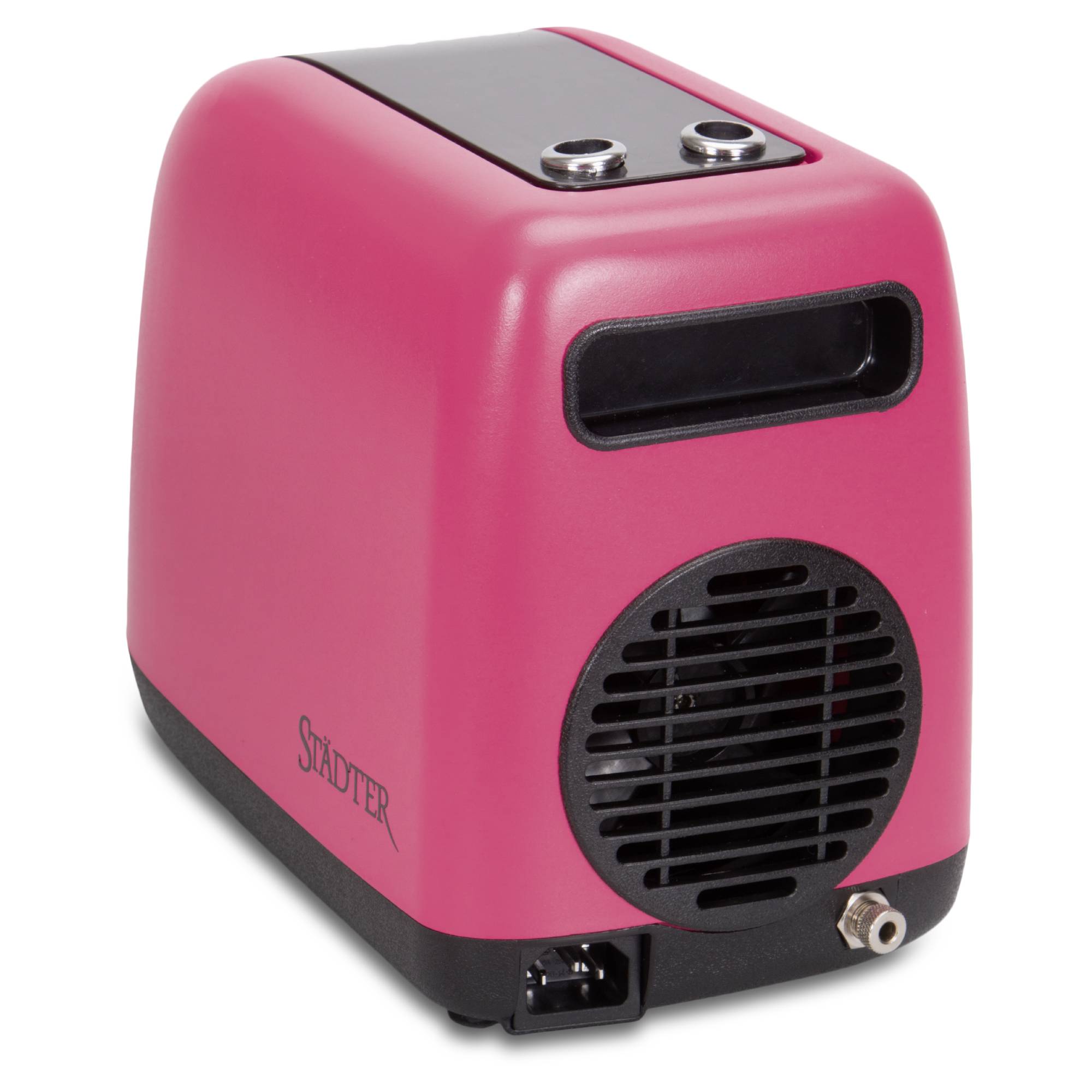Airbrush sada obsahuje: Airbrush kompresor se síťovou zástrčkou, Airbrush pistoli + 2 držáky, 180cm vzduchovou hadici, vzduchový filtr, pipetu a klíč na trysky. Tlakový výkon 3-4bar ( 43-57PSI ). Velikost Airbrush kompresoru 25x14x20,5cm. Airbrush kompresor je opatřený regulátorem výkonu a ukazatelem tlaku/baru.  S tímto Airbrush systémem, můžete lehce barvit a stínovat veškeré potahové hmoty, marcipán, sušenky, pusinky a mnoho jiného pečiva. Výsledkem bude umělecké dílo, které je prací profesionála. Po práci s ním, je důležité pečlivě umýt trysku Airbrush pistole. Doporučujeme používat čistič Airbrushe, popřípadě čistý alkohol. Vždy doporučujeme používat barvy vhodné do Airbrush, které nezanesou trysku pistole.Tento Airbrush, je od známé Německé značky Stadter. Nejen že se sním díky kvalitnímu a výkonnějšímu kompresoru skvěle pracuje, ale navíc i dobře vypadá – odstín růžovo-červené se do cukrářského světa prostě hodí. Tento Airbrush nemusíte využít pouze v cukrařině, používají je i umělci při malbě na plátno, nebo dokonce na tělo. Opět doporučujeme použít barvy vhodné do Airbrushe.