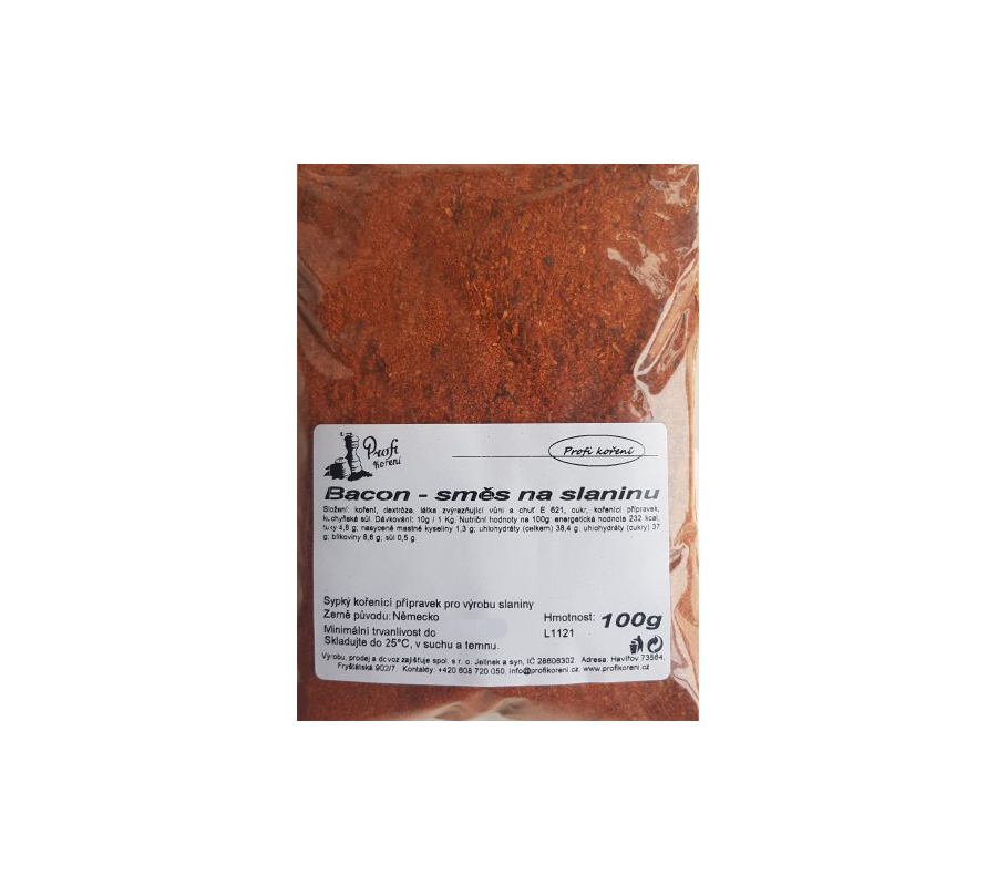 Bacon to je směs koření, se kterým dokonale ochutíte slaninu, maso i uzeniny. Na 1 kg masa připadne 10 g směsi. Složení: koření, dextróza, látka zvýrazňující vůni a chuť E621, cukr, kořenící látky, kuchyňská sůl