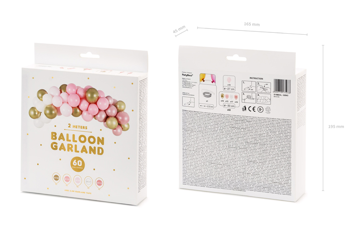 Balónková girlanda, která je dlouhá asi 200 cm. Sada obsahuje: balónky (10 lesklých ve zlatě, 10 pastelových v pastelově růžových, 10 metalických v růžovém zlatě, 13 pastelových růžových a 17 metalických bílých), dále asi 2,5 m stuhu na balónkové girlandy.