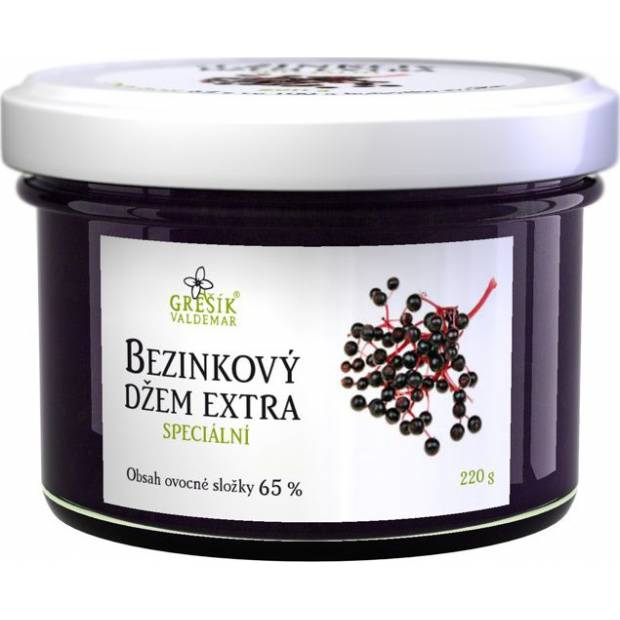 Džem z bezinek extra se sníženým obsahem cukru Grešík. Balení 220 g.