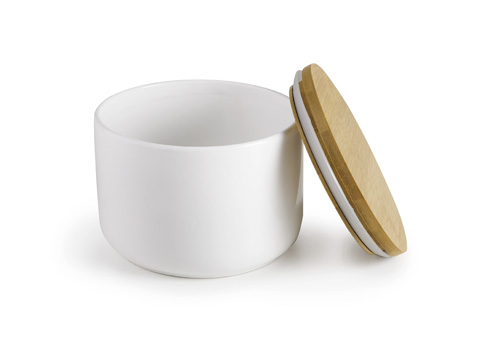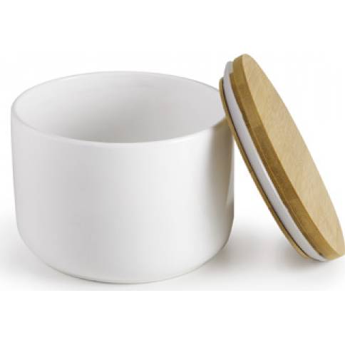Bílá keramická dóza Ibili kulatá, s dřevěným víčkem. Objem 0,5 l.