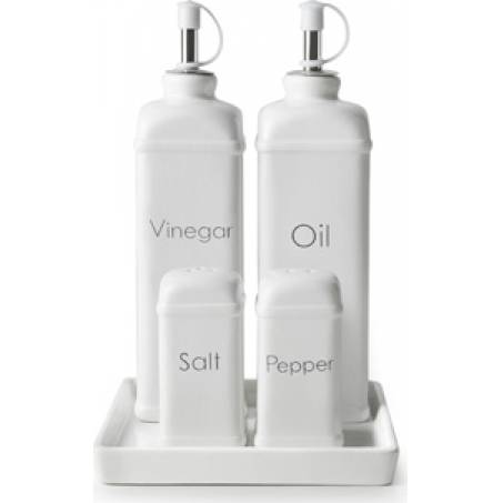 Servírovat pochutiny jako ocet, olej, sůl či pepř jde i stylově. Poslouží vám k tomu tento keramický set, který obsahuje menážky, slánku, pepřenku a podtácek, na kterém jsou všechny nádobky postaveny. Bílá keramická sestava se perfektně hodí do moderní kuchyně, ale i do domácností zařízených ve vintage, selském nebo provensálském stylu. Keramika je odolná, lze ji mýt i v myčce nádobí.Nádoba na olej a ocet má objem 0,34l.