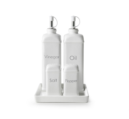 Bílá keramická menážka na olej a ocet. Sada zahrnuje také pepřenku a slánku a keramický podtácek.