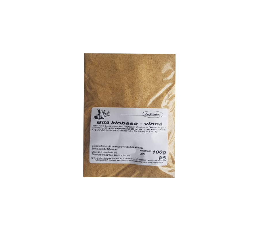 Směs koření, která se skládá z koření, dextróza, kořenící látky, kuchyňská sůl, přírodní aroma je standardizovaná, ve vysoké kvalitě. Snadno s ní ochutíte bílé klobásy. Dávkování:na 1 kg díla 4 - 6 g směsi