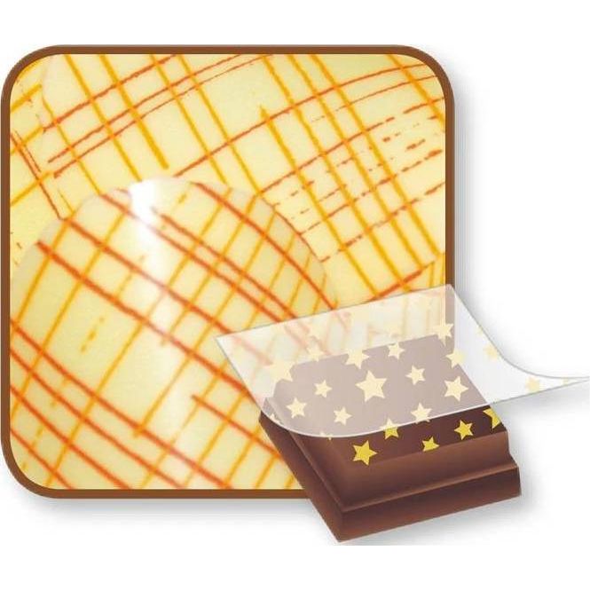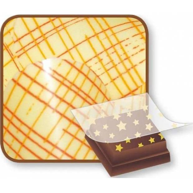 Rozměr: 36,5 x 25 cm (vzor cca 33,5 x 23 cm) Fólie na dekoraci čokolády k použití zejména na pralinky, obtisky na dorty s čokoládovou polevou a ostatní čokoládové výrobky