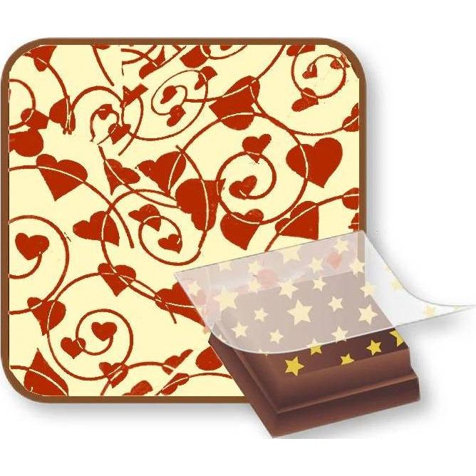 Rozměr: 36,5 x 25 cm (vzor cca 33,5 x 23 cm) Fólie na dekoraci čokolády k použití zejména na pralinky, obtisky na dorty s čokoládovou polevou a ostatní čokoládové výrobky