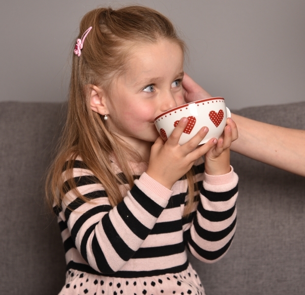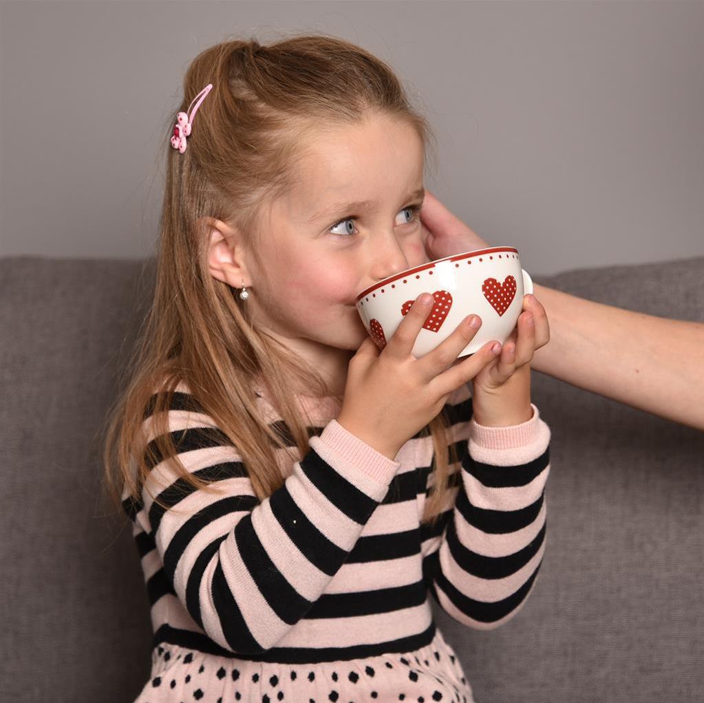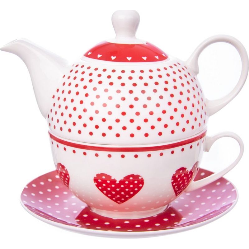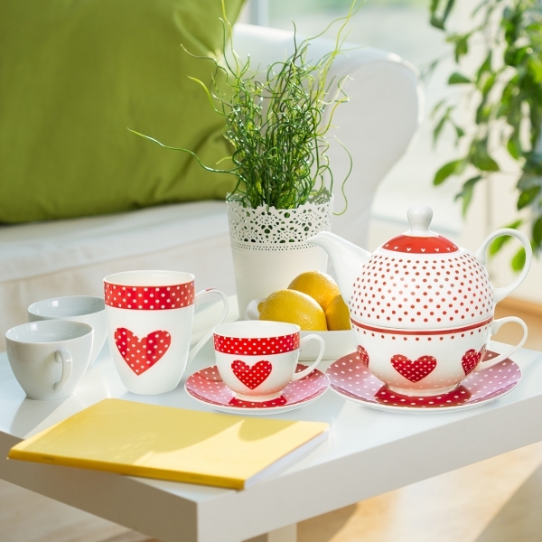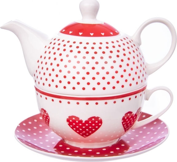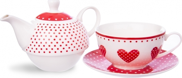 Pro milovníky čajových dýchánků nabízíme tento roztomilý servis na čaj. Je vyrobený z porcelánu a tvoří jej konvička o objemu 540 ml s víkem, větší hrnek o objemu 490 ml a ladící podšálek. Celou sadu spojuje červený dekor puntíků a srdíček, který zaujme svou hravostí a pestrostí.
