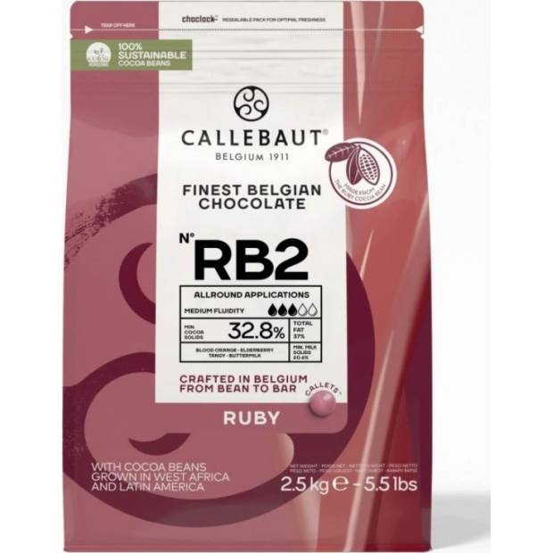 Po hořké, mléčné a bílé čokoládě přichází revoluce: ruby čokoláda Callebaut RB2 s obsahem kakaové sušiny min. 32,8 %. Její oslnivá růžová barva vzniká přirozeně z rubínových kakaových bobů – bez přidaných barviv a bez ovocných příchutí. To, co ochutnáš, je čistá chuť kakaového zrna v úplně nové podobě.