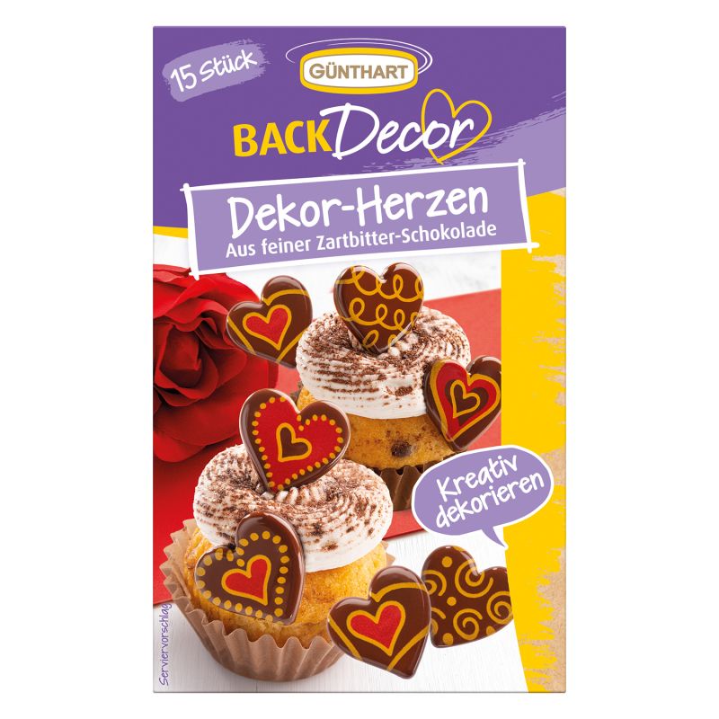 Dodejte svým pečicím výtvorům láskyplný a elegantní nádech s dekorativními srdíčky Günthart BackDecor z jemné hořké čokolády. Tato krásná srdíčka jsou ideální pro kreativní zdobení dortů, cupcaků a zákusků. V jedné prodejní jednotce najdete celkem 15 srdíček, která jsou zdobena atraktivním vzorem v červené a zlaté barvě. Každé srdce je samo o sobě malým uměleckým dílem a udělá z vašeho pečiva opravdový poutač. Tato dekorativní srdíčka vyrobená z vysoce kvalitní hořké čokolády nabízejí nejen dekorativní, ale i lahodný doplněk vašich sladkých výtvorů. Ušlechtilá chuť čokolády svede vaše smysly a potěší vaše hosty. Ať už na Valentýna, narozeniny, výročí nebo jednoduše jako láskyplný dárek – dekorativní srdce Günthart BackDecor jsou všestranná a dodají vašemu slavnostnímu stolu zvláštní akcenty. Ponořte se do světa kreativního zdobení na pečení a vykouzlete úsměv na tvářích svých blízkých s dekorativními srdíčky Günthart BackDecor. Udělejte z každé příležitosti zvláštní a nezapomenutelný okamžik.