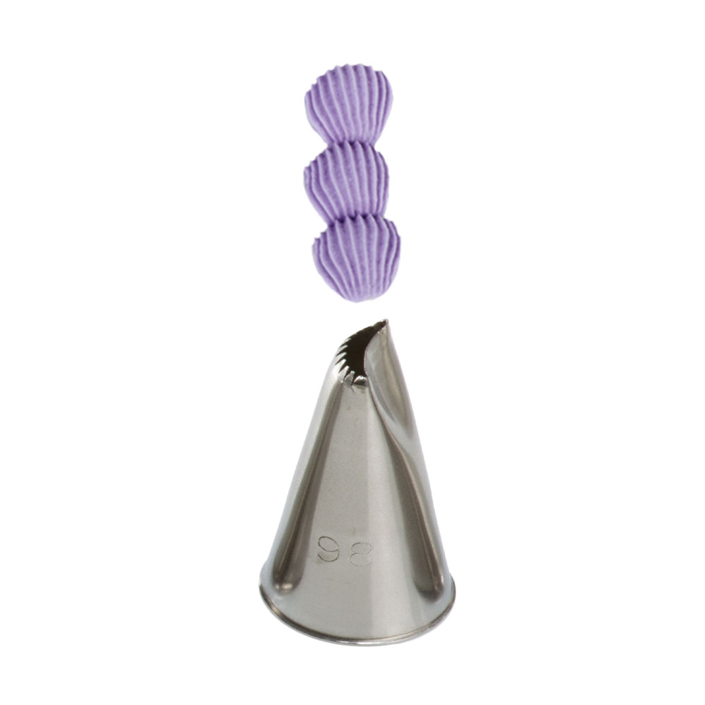 Kovová cukrářská zdobící špička 98 vám zaručí přesnou a jedinečnou výzdobu. Špičku můžete použít se zdobícím sáčkem opakovaně. Je vyrobená z nerezové oceli, na povrchu nezůstávají skvrny od tuku. Není vhodná pro mytí v myčce.