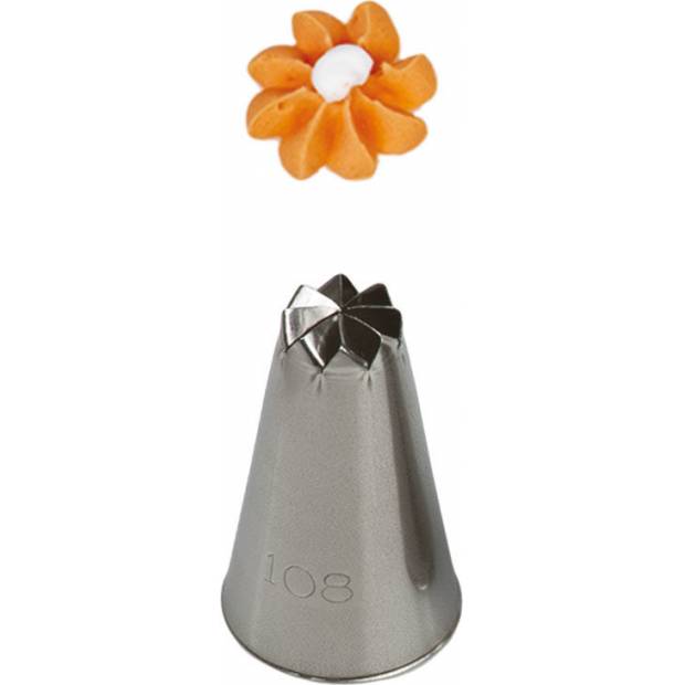 Kovová cukrářská zdobící špička řezaná 108, se kterou zaručeně vytvoříte velmi přesnou a jedinečnou výzdobu. Špičku můžete použít se zdobícím sáčkem opakovaně. Je vyrobená z nerezové oceli, na povrchu nezůstávají skvrny od tuku. Není vhodná pro mytí v myčce.