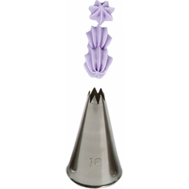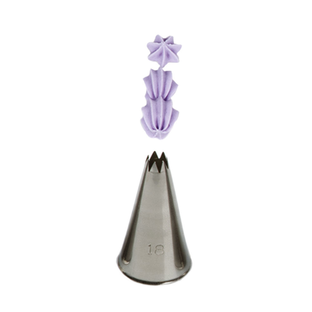 Kovová cukrářská zdobící špička řezaná 18, se kterou zaručeně vytvoříte velmi přesnou a jedinečnou výzdobu. Špičku můžete použít se zdobícím sáčkem opakovaně. Je vyrobená z nerezové oceli, na povrchu nezůstávají skvrny od tuku. Není vhodná pro mytí v myčce.
