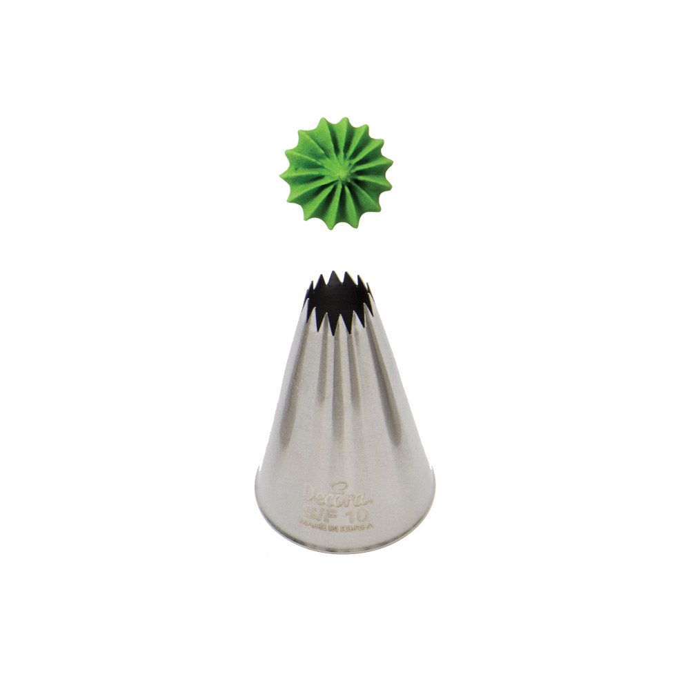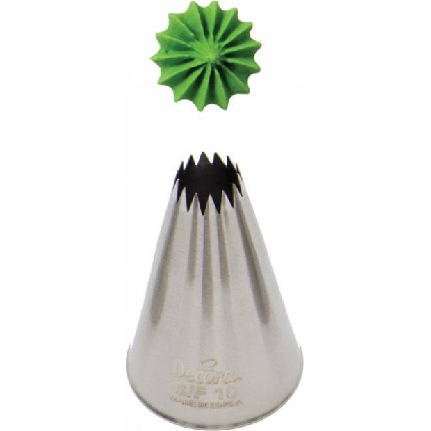 Kovová cukrářská zdobící špička řezaná S/F10 na přesnou a jedinečnou krémovou ozdobu na dort k narozeninám, na svatbu či pro jinou událost. Špičku můžete použít se zdobícím sáčkem opakovaně. Je vyrobená z nerezové oceli, na povrchu nezůstávají skvrny od tuku. Není vhodná pro mytí v myčce.