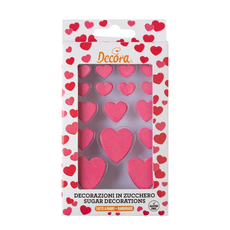 Jemné ručně vyráběné cukrové ozdoby ve tvaru srdce z italské Decora. Srdíčka lze použít ke zdobení dortů, cupcaků, sušenek a jiných sladkostí. Dejte jakékoli květiny fixované jedlým lepidlem.