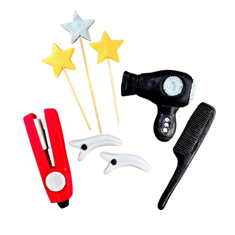 Cukrová dekorace představuje sadu kadeřnického náčiní. Perfektně tak ozdobíte dort pro kadeřnice, milovnice účesů i malé slečny. Sada obsahuje hřeben, fén, žehličku na vlasy nebo sponky a zápichy v podobě hvězd. Vyrobeno z jedlého marcipánu. Fén (1 ks) – 8,5 x 2 x 8,5 cm hrebeň (1 ks) – 12,5 x 0,5 x 2,5 cm Žehlička (1 ks) – 11 x 1,5 x 4 cm Sponky (2 ks) – 6 x 1 x 2,5 cm hvězdy (3 ks) – 4 x 0,5 x 3 cm