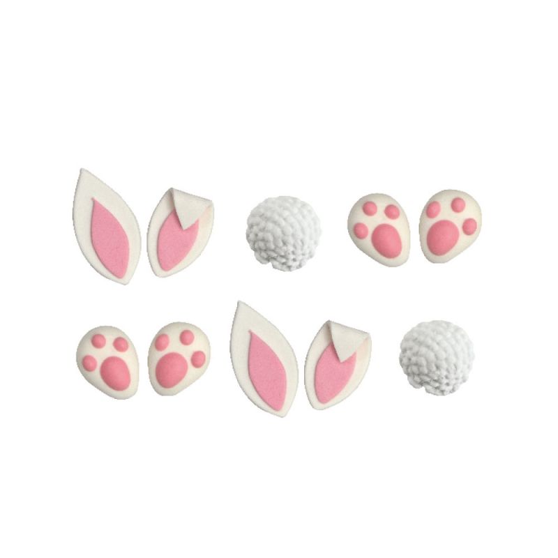 Už nehledejte tu správnou dekoraci na dotvoření vašich velikonočních zákusků. Vyberte si tuto sadu cukrových dekorací představující uši, tlapky a ocas králíka a dodejte svým výtvorům originální nádech. Tyto dekorace jsou ideální pro zpestření vašich dortů, cupcaků nebo dortů a potěší malé i velké během velikonočních oslav. Jejich hravý, jarní design dodá všem vašim výtvorům slavnostní nádech. Ozdoby položte na dezerty těsně před podáváním, protože v lednici nemusí dlouho vydržet a mohly by se rozpustit. Obsahuje: 10 kusů Rozměry: cca. 1,5 - 3,5 cm Skladování: skladujte na chladném a suchém místě mimo zdroje světla a tepla. Křehké, zacházejte opatrně.