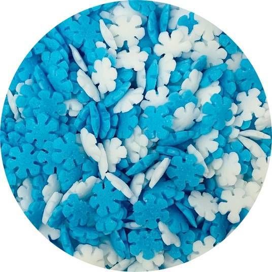 Cukrové konfety na cukrářské výrobky (sušenky, dorty, zákusky, zmrzlina, cupcaky, muffiny, dorty). Konfety mají tvrdou texturu, takže se dobře lepí na různé druhy hmot a zmrzliny. Měly by být skladovány v těsně uzavřeném obalu a chráněny před slunečním zářením Složení: cukr (83%), kukuřičný škrob, rostlinný tuk (palmový), voda, bramborový škrob, rýžová mouka, aroma: vanilin, barvivo: titanová běloba (E171), brilantní modř (E133). Může obsahovat stopy vajec, mléka a ořechů.
