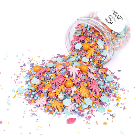 Pokud byste si mohli zarezervovat dovolenou v plechovce, pak by Vacation Ready bylo to nejlepší místo pro dovolenou na celém světě. Nasypte na zmrzlinu, letní ledničkové dorty nebo ovocné dezerty posypky připravené na dovolenou a budete se cítit jako na pláži pod palmami. Uvnitř najdete listy monstery a palmy v šeříku, pomeranči a bobulích, oranžové a stříbrné čokoládové koule, plus obrovské konfetové posypy v tyrkysové, stejně jako koule a konfety v oranžové, fialové, tyrkysové a bobulovité. Složení: cukr, pšeničný škrob, glukóza, bramborový škrob, glukózový sirup, slunečnicový olej, rýžová mouka, rostlinný olej (kokos), mléčná čokoláda [cukr, kakaové máslo, sušené plnotučné MLÉKO, kakaová hmota, emulgátor: sójový lecitin, přírodní vanilkové aroma ], stabilizátor: arabská guma, cukerné estery mastných kyselin; Škrob (rýžový/kukuřičný), barviva: E101, E120, E132, E133, E160a, E172, E174; Zahušťovadlo: maltodextrin; Nátěrové látky: šelak, včelí vosk, karnaubský vosk; Může obsahovat stopy ořechů. Obsah energie a živin na 100 g: Energie: 1736 kJ/410 kcal; Tuky: 3,7g, z toho nasycené mastné kyseliny: 1,9g; Sacharidy: 93,5g, z toho cukry: 89,3g; Bílkoviny: 0,6g; Sůl: 0,01 g