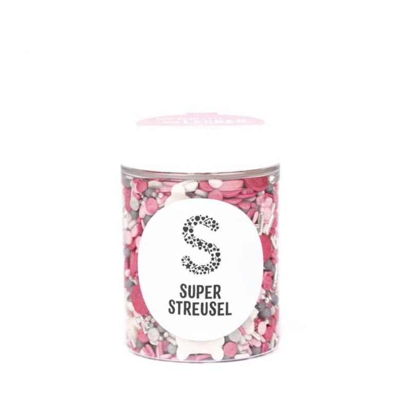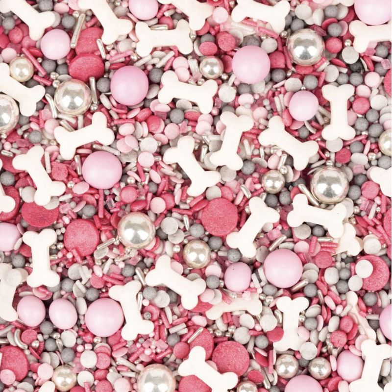 Dosáhněte se svými pečícími misemi až na samotný vrchol. Směs nazvaná Wuffelinchen neohroženě vyšperkuje vaše dorty, cupcaky nebo dorty na narozeninovou oslavu. Ideální pro všechny psí fanoušky, velké i malé, kteří mají rádi růžovou a chtějí věnovat svou tematickou párty našim chlupatým hrdinům. Malé kosti, růžové a šedé konfetové posypy, růžové a stříbrné nonpareils a čokoládové kuličky jsou připraveny k použití 24 hodin denně na narozeninové dorty, tématické dorty nebo muffiny v psím stylu. Podlouhlé tyčinky obsahují tenké, syrové nudle potažené cukrem. Jsou sice jedny z nejhezčích, ale také nejtěžších, co naše směsi nabízejí. Užívejte si tedy s rozvahou. Kuličky: Naše střední a velké kuličky jsou všechny lahodně plněné jemnou čokoládou nebo křupavé křupavé. Báječný! Míchání: Během přepravy se velké posypy a čokoládové kuličky obvykle sesypou do středu plechovky. Abyste se mohli pokochat plnou sypanou nádherou, stačí plechovku vyklopit do misky a nechat se okouzlit. Složení: cukr, glukóza, pšeničný škrob, bramborový škrob, glukózový sirup, slunečnicový olej, rýžová mouka, rostlinný olej (kokos), mléčná čokoláda [cukr, kakaové máslo, sušené plnotučné mléko, kakaová hmota, emulgátor: sójový lecitin, přírodní vanilkové aroma ], sušenková náplň [rýžová mouka, pšeničná mouka, cukr, pšeničná sladová mouka, pšeničný lepek, sůl], pšeničná mouka, stabilizátor: arabská guma, cukerné estery mastných kyselin, agar; Škrob (rýžový/kukuřičný), kakaové máslo, barviva: E120, E153, E172, E174; Nátěrové látky: šelak, včelí vosk, karnaubský vosk; Může obsahovat stopy ořechů. Obsah energie a živin na 100 g: Energie: 1724 kJ/407 kcal; Tuky: 3,3 g, z toho nasycené mastné kyseliny: 1,5 g; Sacharidy: 93,6g, z toho cukry: 87,7g; Bílkoviny: 0,8g; Sůl: 0,02 g