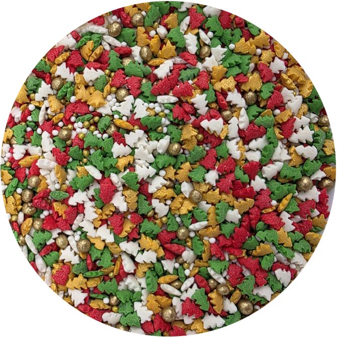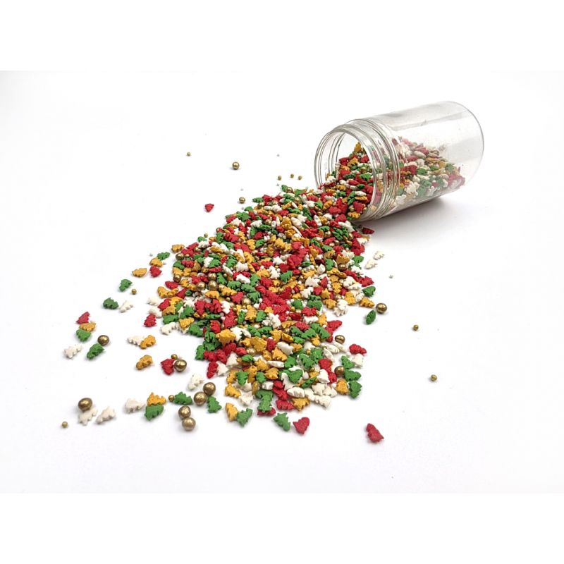 Sypání má podobu mixu sestaveného z různě barevných cukrových stromečků. Jedná se o sladký posyp z řady unikátních produktů od ILOVECAKES. NeměníPokud zdobení nasypete na vláčný krém, vlhkost z něj může posypek změkčit. Ale pozor, pokud bude zdobení na vlhkém krému delší dobu, může se z posypku uvolnit i barvivo a to na povrch krému. Pokud chcete, aby větší části dekorace drželi například na potahovém dortu, můžete tento druh zdobení k dortům lepit polotuhou čokoládou, nebo glazurou na perníčky. s posypky pracujte nejlépe nad miskou, či plechem s okrajem. chuť zdobených výrobků, je vyroben z přírodních barviv a má chuť cukrové pasty. Jedná se o velmi univerzální zdobení, ideální na dekorování cupcaků, sušenek, perníčků, muffinů, dortů, zákusků, pečiva, dortů, pralinek, lanýžů, čokolády, zmrzliny a mnoha dalších sladkých výrobků, zejména těch s krémy a polevou. Je vhodný pro každou příležitost: zejména pro vánoční dorty a cukroví. Baleno v praktické šroubovací dóze.
