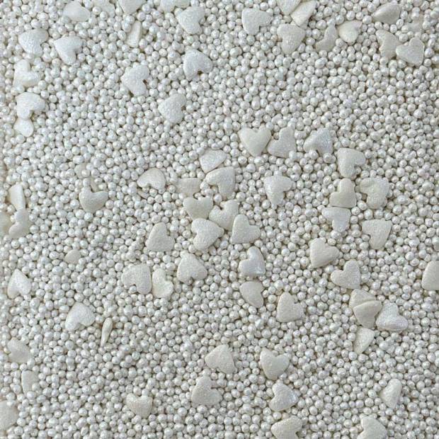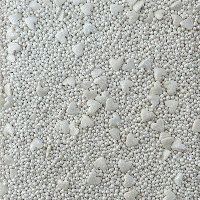 Cukrové posypky v podobě bílých cukrových ozdob jve tvaru srdíček a perliček jsou perfektním doplňkem dortů, koláčů a dalšího pečiva. Vločky dodají kouzlo a romantickou atmosféru každé kompozici dezertu. Díky nim můžete vyjádřit krásu jedinečným a vkusným způsobem. Tyto dekorativní prvky jsou perfektní pro zdobení dortů k různým příležitostem, jako jsou narozeniny, Vánoce, ale i zásnuby nebo výročí, dodávají jim jedinečné kouzlo a eleganci. Pokud zdobení nasypete na vláčný krém, vlhkost z něj může posypek změkčit. Ale pozor, pokud bude zdobení na vlhkém krému delší dobu, může se z posypku uvolnit i barvivo a to na povrch krému. Pokud chcete, aby větší části dekorace drželi například na potahovém dortu, můžete tento druh zdobení k dortům lepit polotuhou čokoládou, nebo glazurou na perníčky. s posypky pracujte nejlépe nad miskou, či plechem s okrajem.