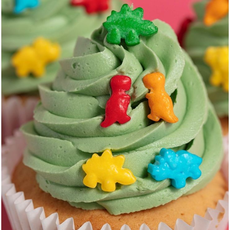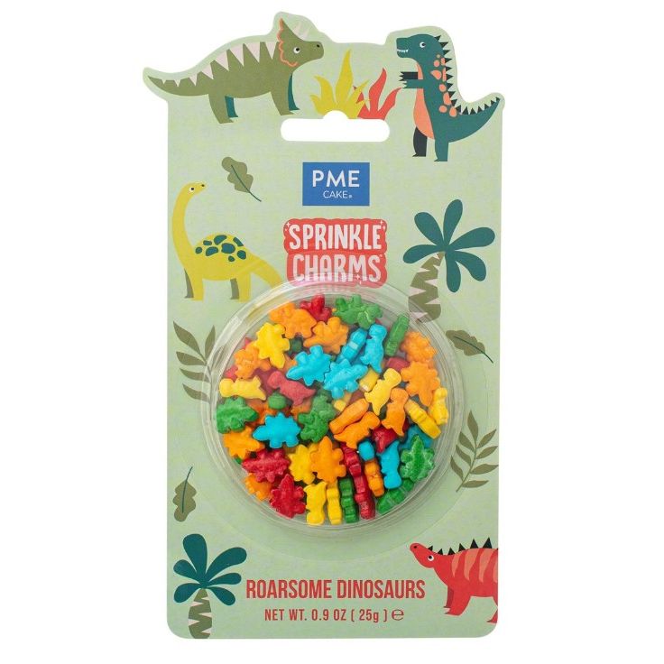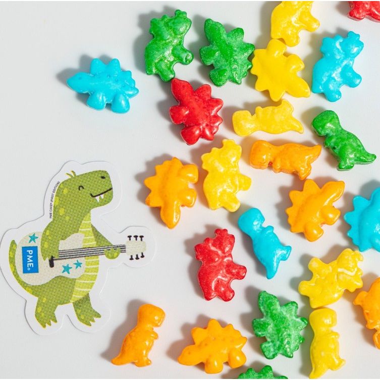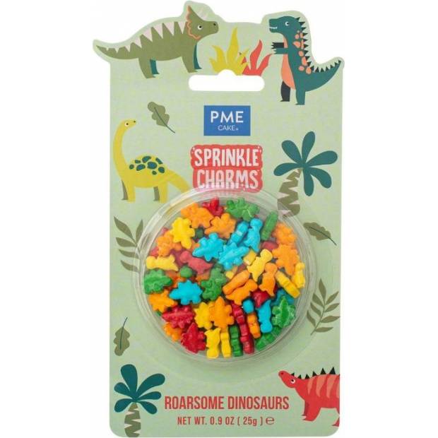 Tyto posypky od PME jsou jedlé doplňky, na které vaše pečivo čekalo. Posypky obsahují barevné dinosaury. Každý posyp je malé sousto, které okamžitě rozzáří vaše dobroty! Skvělé na zmrzlinu nebo na koblihy, dezerty, cupcakes a další. Každý posyp dodá okamžitou zábavu, barvu a charakter. Složení: Dextróza, kukuřičný škrob, dextrin, zahušťovadlo (E414), protispékavá látka (E470b), aroma, lešticí látky (E904, E903), barviva (E160a, E133, E120).