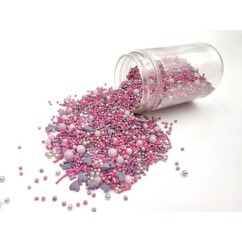 Růžovo-stříbrný mix perliček, fialových srdíček, růžového a stříbrného máčku, který oceníte jako doplněk valentýnských dezertů, dortíků na babyshower, pro párty ve stylu Barbie, apod. Obsahuje růžové cukrové tyčinky, perličky, stříbrný máček a větší perličky. I LOVE CAKES v různých tvarech vám pomohou zajímavým způsobem ozdobit muffiny, dorty, koláče, dezerty, cake pops, sušenky a další sladkosti. Posypky budou krásnou ozdobou pečiva na nejrůznější párty, výročí nebo na dort k narozeninám. Cukrové posypky se budou hodit při přípravě sladkostí na sladký stůl. Posypky jsou baleny v praktické nádobě pro snadné dávkování a skladování. Skladujte na chladném a suchém místě mimo dosah slunečního záření.Pokud zdobení nasypete na vláčný krém, vlhkost z něj může posypek změkčit. Ale pozor, pokud bude zdobení na vlhkém krému delší dobu, může se z posypku uvolnit i barvivo a to na povrch krému. Pokud chcete, aby větší části dekorace drželi například na potahovém dortu, můžete tento druh zdobení k dortům lepit polotuhou čokoládou, nebo glazurou na perníčky. S posypkami pracujte nejlépe nad miskou, či plechem s okrajem."""
