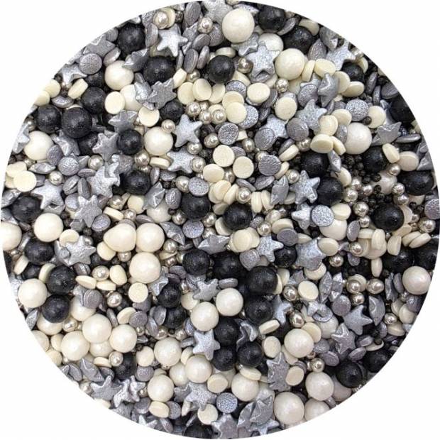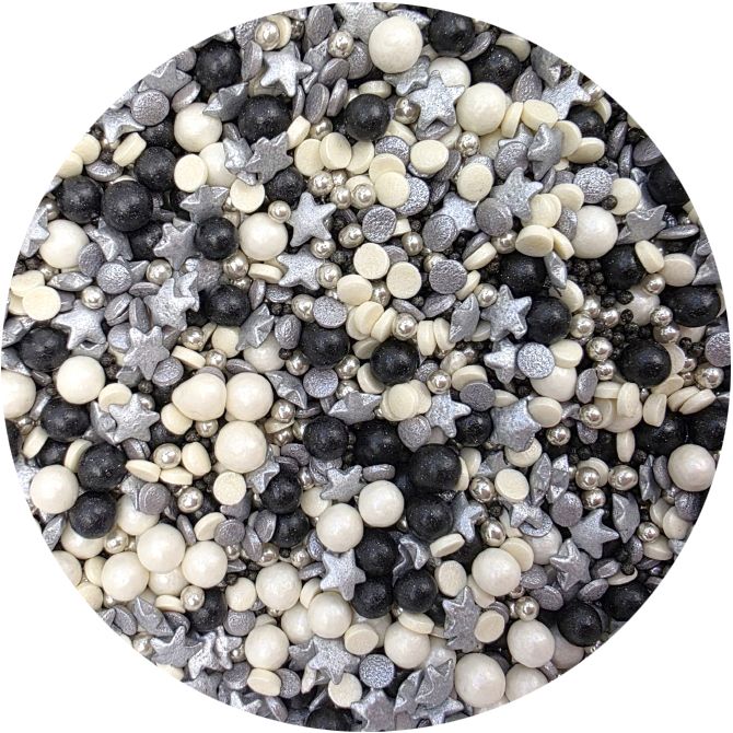 Stříbrné hvězdičky, bílé perličky, stříbrný máček a černé perly tvoří jedinečnou směs zvanou Hvězdná noc. Vaše dezerty a dorty tak získají přímo kosmický nádech. I LOVE CAKES v různých tvarech vám pomohou zajímavým způsobem ozdobit muffiny, dorty, koláče, dezerty, cake pops, sušenky a další sladkosti. Posypky budou krásnou ozdobou pečiva na nejrůznější párty, výročí nebo na dort k narozeninám. Cukrové posypky se budou hodit při přípravě sladkostí na sladký stůl. Posypky jsou baleny v praktické nádobě pro snadné dávkování a skladování. Skladujte na chladném a suchém místě mimo dosah slunečního záření.Pokud zdobení nasypete na vláčný krém, vlhkost z něj může posypek změkčit. Ale pozor, pokud bude zdobení na vlhkém krému delší dobu, může se z posypku uvolnit i barvivo a to na povrch krému. Pokud chcete, aby větší části dekorace drželi například na potahovém dortu, můžete tento druh zdobení k dortům lepit polotuhou čokoládou, nebo glazurou na perníčky. S posypkami pracujte nejlépe nad miskou, či plechem s okrajem."
