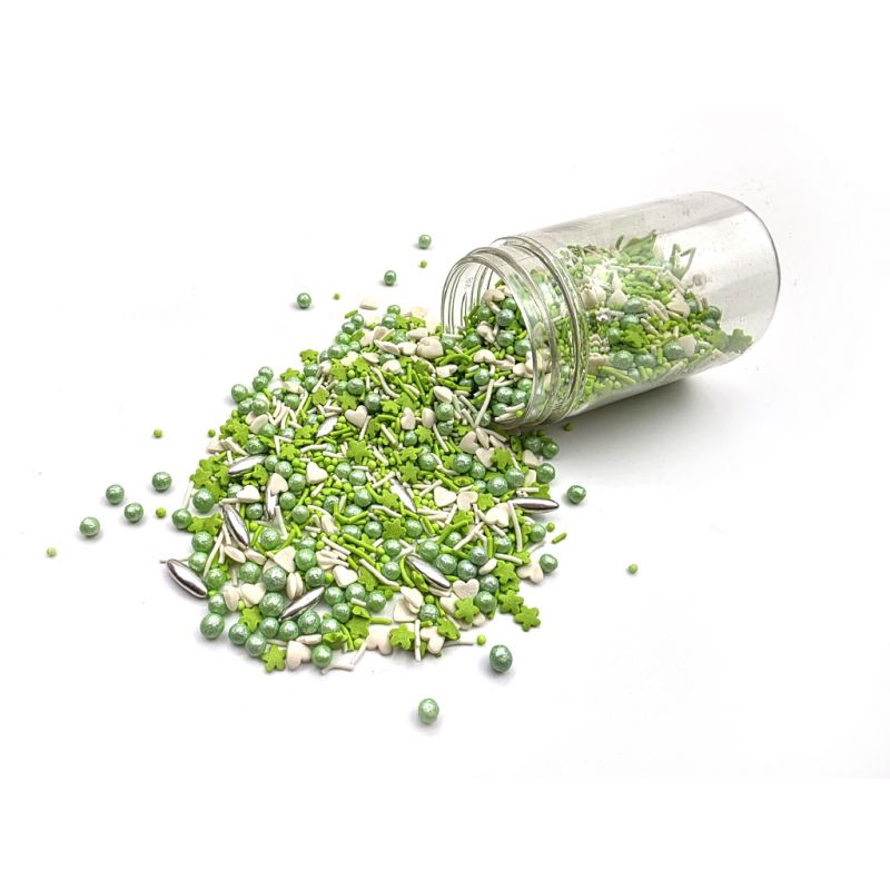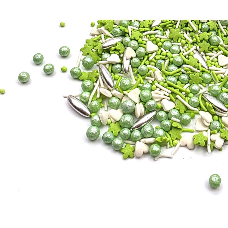 V praktické dóze najdete mix bílých srdíček, zelených perliček, čtyřlístků a drobného máčku. Směs oceníte jako doplněk nejrůznějších dezertů na Velikonoce, svátek sv. Patrika, dortíků na babyshower, pro párty v jarním stylu, apod. I LOVE CAKES v různých tvarech vám pomohou zajímavým způsobem ozdobit muffiny, dorty, koláče, dezerty, cake pops, sušenky a další sladkosti. Posypky budou krásnou ozdobou pečiva na nejrůznější párty, výročí nebo na dort k narozeninám. Cukrové posypky se budou hodit při přípravě sladkostí na sladký stůl. Posypky jsou baleny v praktické nádobě pro snadné dávkování a skladování. Skladujte na chladném a suchém místě mimo dosah slunečního záření.Pokud zdobení nasypete na vláčný krém, vlhkost z něj může posypek změkčit. Ale pozor, pokud bude zdobení na vlhkém krému delší dobu, může se z posypku uvolnit i barvivo a to na povrch krému. Pokud chcete, aby větší části dekorace drželi například na potahovém dortu, můžete tento druh zdobení k dortům lepit polotuhou čokoládou, nebo glazurou na perníčky. S posypkami pracujte nejlépe nad miskou, či plechem s okrajem.