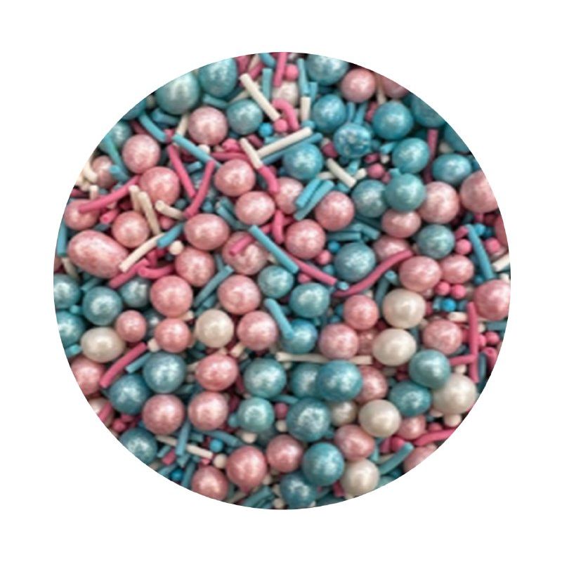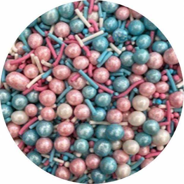 Cukrové zdobení Kluk nebo holka? je perfektním způsobem, jak dodat dezertům na oslavu narozenin nebo oslavu miminka nádech tajemství a radosti. Skládá se z různých cukrových prvků v metalických odstínech růžové a modré, které dokonale ladí s tématem „chlapec, nebo holka?. Díky svému okouzlujícímu vzhledu ve tvaru srdíček a malých koleček se tato posypka stane ozdobou nejen dortů, ale i cupcaků, dortů, zmrzliny a dalších sladkostí. Tyto barevné prvky jsou jemné, okouzlující a krásně kontrastují se světlou smetanou nebo tmavou čokoládou, čímž dodávají pečeným výrobkům jedinečný vzhled. Proměnit jednoduchý dezert v sofistikovanou cukrářskou dekoraci trvá jen pár okamžiků. Tato posypka byla vytvořena s ohledem na speciální okamžiky, jako je například oslava narození miminka. Je také ideální volbou pro jiné události, jako jsou dětské narozeniny nebo rodinné oslavy, kde záleží na každém detailu. Použití tohoto barevného mixu v odstínech růžové a modré dodává dezertu zajímavý vzhled, který jistě upoutá pozornost všech hostů.Pokud zdobení nasypete na vláčný krém, vlhkost z něj může posypek změkčit. Ale pozor, pokud bude zdobení na vlhkém krému delší dobu, může se z posypku uvolnit i barvivo a to na povrch krému. Pokud chcete, aby větší části dekorace drželi například na potahovém dortu, můžete tento druh zdobení k dortům lepit polotuhou čokoládou, nebo glazurou na perníčky. s posypky pracujte nejlépe nad miskou, či plechem s okrajem.