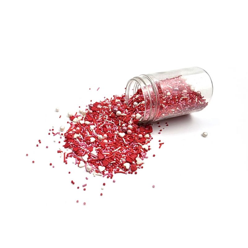 Nechte své pečivo zářit. Tato exkluzivní směs se skládá z perlového základu v teplém bílém odstínu s přídavkem červené a růžové. Láska na první pohled dodá vašim sladkostem nejen lesk, ale také jedinečnou chuť a texturu, díky čemuž se stanou nezapomenutelným zážitkem. Jemné detaily dodají každému vašemu výtvoru jedinečný charakter. Sypání je perfektní volbou pro ty, kteří si cení elegance a sofistikovanosti. Pokud zdobení nasypete na vláčný krém, vlhkost z něj může posypek změkčit. Ale pozor, pokud bude zdobení na vlhkém krému delší dobu, může se z posypku uvolnit i barvivo a to na povrch krému. Pokud chcete, aby větší části dekorace drželi například na potahovém dortu, můžete tento druh zdobení k dortům lepit polotuhou čokoládou, nebo glazurou na perníčky. s posypky pracujte nejlépe nad miskou, či plechem s okrajem.