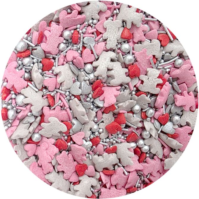 Tento mix obsahuje růžové a stříbrné medvídky, perličky, tyčinky a srdíčka. Je skvělou volbou pro široké spektrum událostí. Můžete s nimi ozdobit cupcakes, dorty i vánoční cukroví. Posypky budou krásně vypadat na dortících nebo jiném pečivu.Ideální pro různé příležitosti, např. oslava narození dítěte, narozeniny, jmeniny, svatby, přijímání, křtiny, rozlučky se svobodou, svátky. Posypky jsou baleny v praktické nádobě pro snadné dávkování a skladování. Skladujte na chladném a suchém místě mimo dosah slunečního záření. Pokud zdobení nasypete na vláčný krém, vlhkost z něj může posypek změkčit. Ale pozor, pokud bude zdobení na vlhkém krému delší dobu, může se z posypku uvolnit i barvivo a to na povrch krému. Pokud chcete, aby větší části dekorace drželi například na potahovém dortu, můžete tento druh zdobení k dortům lepit polotuhou čokoládou, nebo glazurou na perníčky. s posypky pracujte nejlépe nad miskou, či plechem s okrajem.