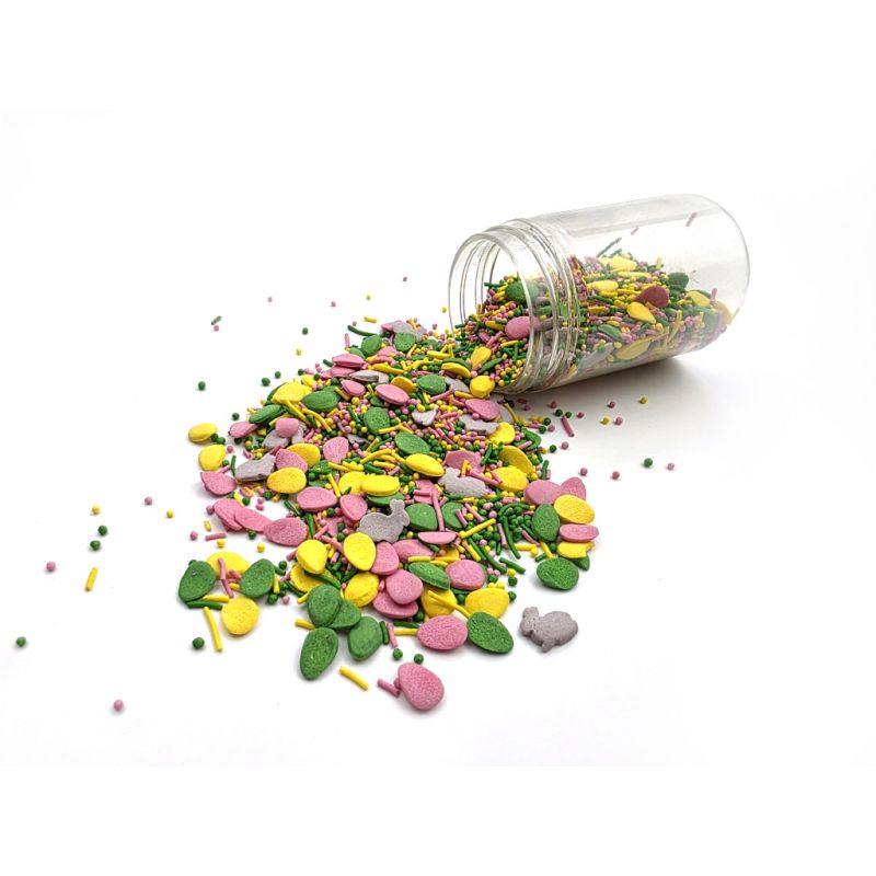 Sypání má podobu velikonočních motivů. Najdete v něm velikonoční vajíčka, zajíčky, máček i cukrové tyčinky. Jedná se o sladký posyp z řady unikátních produktů od ILOVECAKES. Nemění chuť zdobených výrobků, je vyroben z přírodních barviv a má chuť cukrové pasty. Jedná se o velmi univerzální zdobení, ideální na dekorování cupcaků, sušenek, perníčků, muffinů, dortů, zákusků, pečiva, dortů, pralinek, lanýžů, čokolády, zmrzliny a mnoha dalších sladkých výrobků, zejména těch s krémy a polevou. Je vhodný pro každou příležitost: svatba, karneval, narozeniny, Den matek a mnoho dalších. Baleno v praktické šroubovací dóze. Pokud zdobení nasypete na vláčný krém, vlhkost z něj může posypek změkčit. Ale pozor, pokud bude zdobení na vlhkém krému delší dobu, může se z posypku uvolnit i barvivo a to na povrch krému. Pokud chcete, aby větší části dekorace drželi například na potahovém dortu, můžete tento druh zdobení k dortům lepit polotuhou čokoládou, nebo glazurou na perníčky. s posypky pracujte nejlépe nad miskou, či plechem s okrajem.
