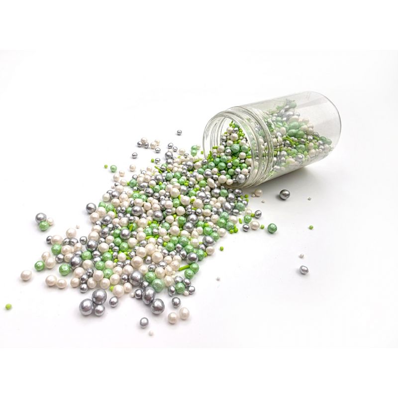 Ať už chystáte dort na den sv. Patrika nebo na Zelený čtvrtek, nezapomeňte ani na pořádnou dávku tohoto mixu sypání v tónech zelené. I LOVE CAKES cukrové sypání v odstínech zelené a různých tvarech vám pomohou zajímavým způsobem ozdobit muffiny, dorty, koláče, dezerty, cake pops, sušenky a další sladkosti. Posypky budou krásnou ozdobou pečiva na nejrůznější párty, výročí nebo na dort k narozeninám. Budou se skvěle hodit při přípravě sladkostí na slavnostní stůl. Posypky jsou baleny v praktické nádobě pro snadné dávkování a skladování. Skladujte na chladném a suchém místě mimo dosah slunečního záření. Pokud zdobení nasypete na vláčný krém, vlhkost z něj může posypek změkčit. Ale pozor, pokud bude zdobení na vlhkém krému delší dobu, může se z posypku uvolnit i barvivo a to na povrch krému. Pokud chcete, aby větší části dekorace drželi například na potahovém dortu, můžete tento druh zdobení k dortům lepit polotuhou čokoládou, nebo glazurou na perníčky. s posypky pracujte nejlépe nad miskou, či plechem s okrajem.