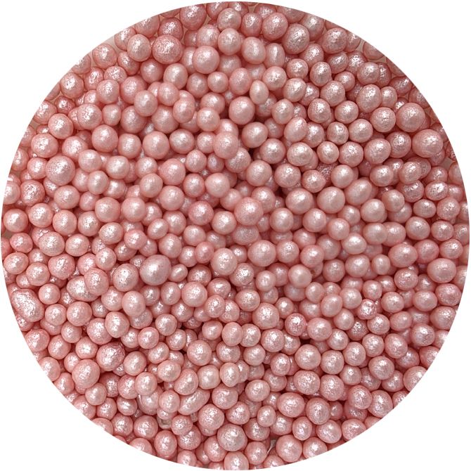 Růžové perleťové perly vyrobené z rýžových lupínků a cukru. Jsou perfektní na zdobení dortů, zmrzliny, zákusků a perníčků. Objevte kouzlo těchto perel, které promění každý dezert v umělecké dílo. Jsou více než jen dekorace - jsou to drobné akcenty, které dodávají lesk a jedinečnost vašim sladkým výtvorům. Jsou vyrobené z nejkvalitnějších surovin. Jejich povrchová úprava je inovativním přístupem k dekoraci, která vyčnívá z tradičních jedlých ozdob.Pokud zdobení nasypete na vláčný krém, vlhkost z něj může posypek změkčit. Ale pozor, pokud bude zdobení na vlhkém krému delší dobu, může se z posypku uvolnit i barvivo a to na povrch krému. Pokud chcete, aby větší části dekorace drželi například na potahovém dortu, můžete tento druh zdobení k dortům lepit polotuhou čokoládou, nebo glazurou na perníčky. s posypky pracujte nejlépe nad miskou, či plechem s okrajem.