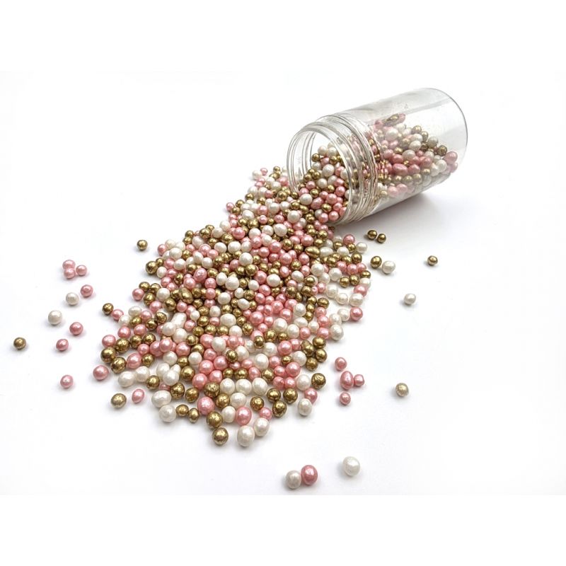 5 mm velké růžové, bílé a zlaté perly jsou vyrobené z rýžových lupínků a cukru. Jsou perfektní na zdobení dortů, zmrzliny, zákusků a perníčků. Objevte kouzlo těchto perel, které promění každý dezert v umělecké dílo. Jsou více než jen dekorace - jsou to drobné akcenty, které dodávají lesk a jedinečnost vašim sladkým výtvorům. Jsou vyrobené z nejkvalitnějších surovin. Jejich povrchová úprava je inovativním přístupem k dekoraci, která vyčnívá z tradičních jedlých ozdob. Pokud zdobení nasypete na vláčný krém, vlhkost z něj může posypek změkčit. Ale pozor, pokud bude zdobení na vlhkém krému delší dobu, může se z posypku uvolnit i barvivo a to na povrch krému. Pokud chcete, aby větší části dekorace drželi například na potahovém dortu, můžete tento druh zdobení k dortům lepit polotuhou čokoládou, nebo glazurou na perníčky. s posypky pracujte nejlépe nad miskou, či plechem s okrajem.