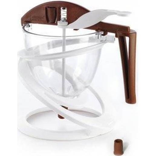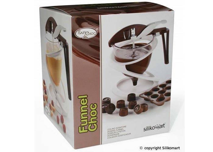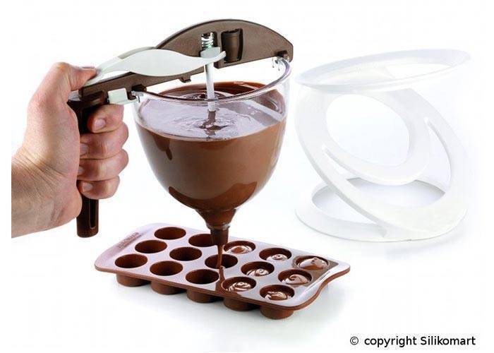 Nádoba vám usnadní výrobu čokoládových bonbonů. Nádobu položíte na stojan a nalijete do ní čokoládu. Jemným stisknutím pak dávkujete malé množství čokolády do formiček.