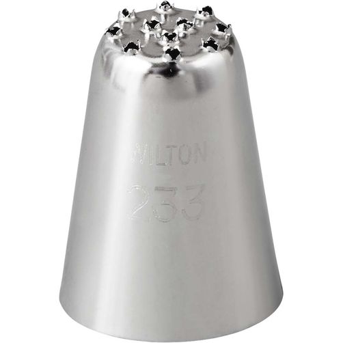 Kovový dekorační hrot od Wiltonu pro vytváření čar, not a dalších zajímavých tvarů. Jednotlivě balené v blistru. Špička je vhodná pro přípravu cupcakes, muffinů. Určená pro všechny spojky na zdobící sáček. Nasaďte koncovku na zdobící sáček naplněný krémem a stiskněte. Zdobítko je snadno omyvatelné, je lepší jej dokonale umýt v ruce. Otvory vyčistíte kartáčkem určeným přímo na špičky. Vytvořit s ní můžete květiny z máslového či jiného krému.