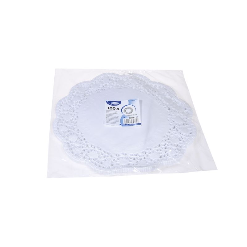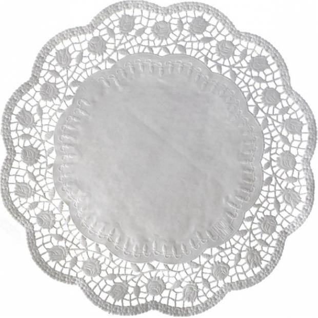 Dekorativní krajka kulatá, bílá. Průměr 32 cm, balení 100 ks.