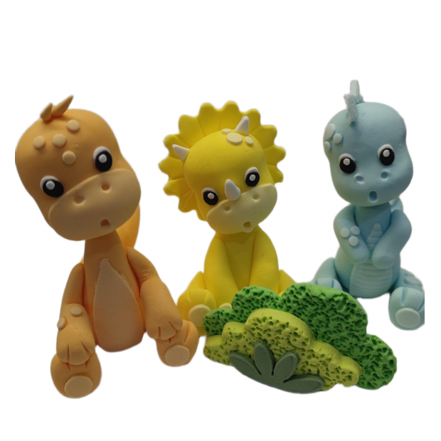 Sada tří ručně modelovaných dinosaurů, kteří promění každý dort v veselý pravěký svět plný barev a roztomilosti.