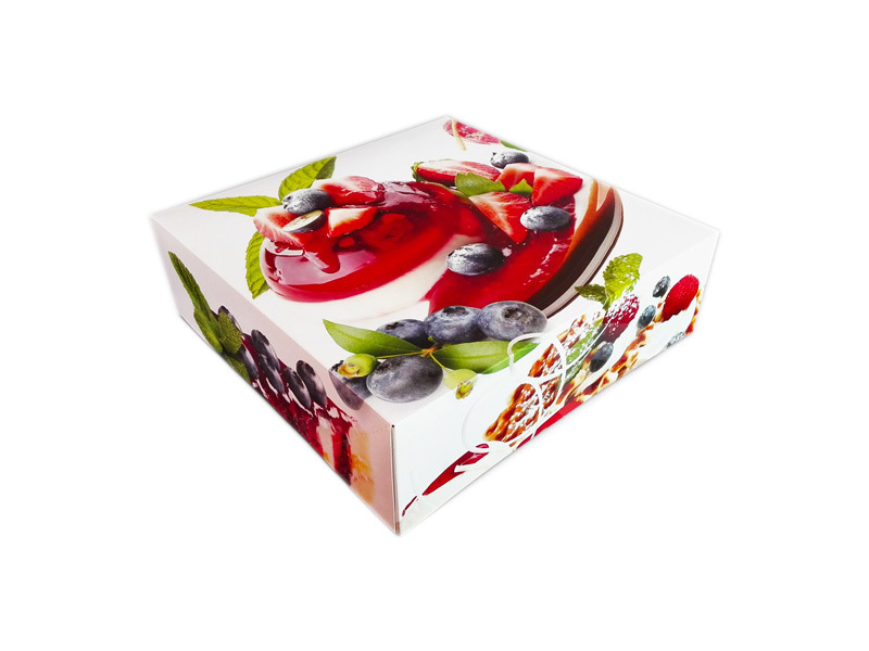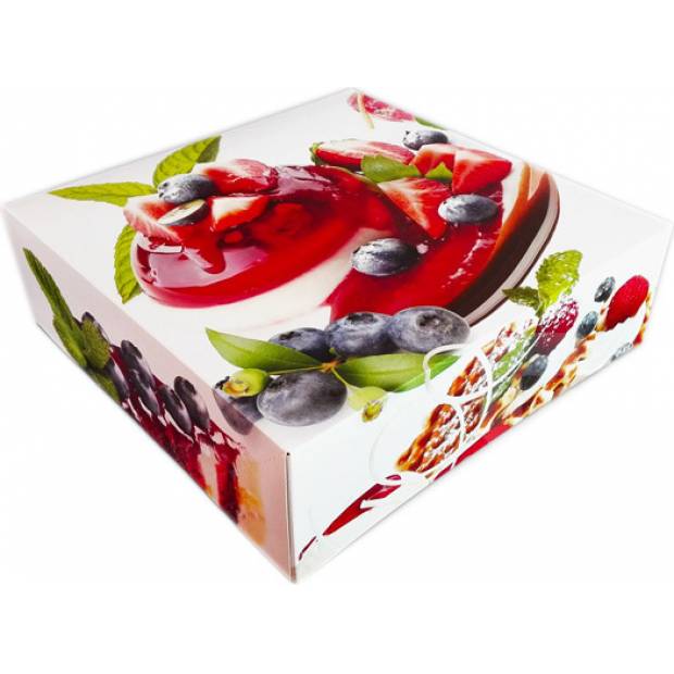 "Krabice na větší dorty a rolády, případně na větší množství cukroví nebo zákusků, vyrobená z kvalitního tvrdého papíru s potiskem.
