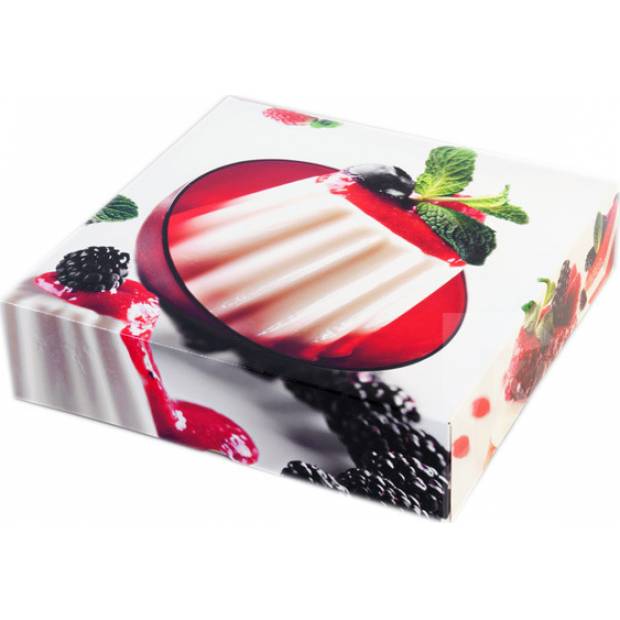 "Velká krabice z kvalitního potištěného papíru, vhodná na přenášení větších dortů, případně většího množství zákusků, cukroví, koláčů nebo jiných výrobků.