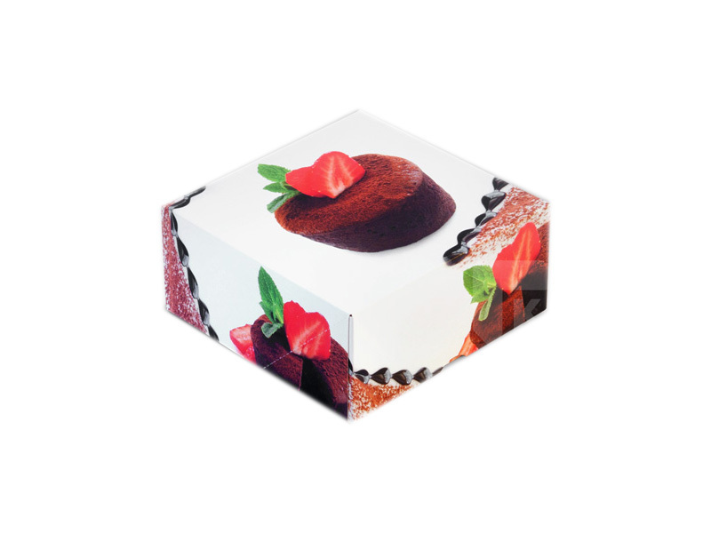 "Krabice z kvalitního silnějšího papíru s barevným potiskem, určená pro přenášení dortů, rolád, zákusků, cukroví a různých dalších druhů pečiva.