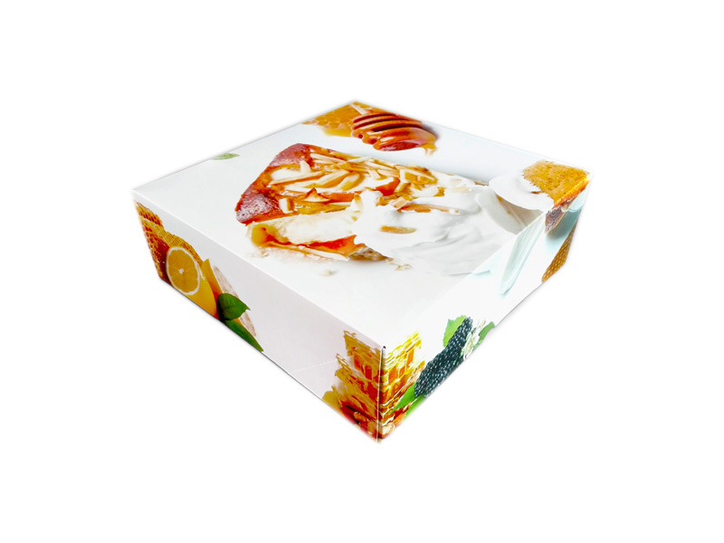 "Větší barevně potištěná krabice, vyrobená z kvalitního tvrdého papíru, použitelná na přenášení dortů, rolád, zákusků, cukroví a dalších moučníků.