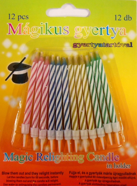 Sada 12 ks krátkých dortových svíček ve 4 barevných provedení. Svíčky se na dortu po sfouknutí znovu samy rozhoří. Nesfouknutelné svíčky ozdobí dort při každé dětské oslavě.