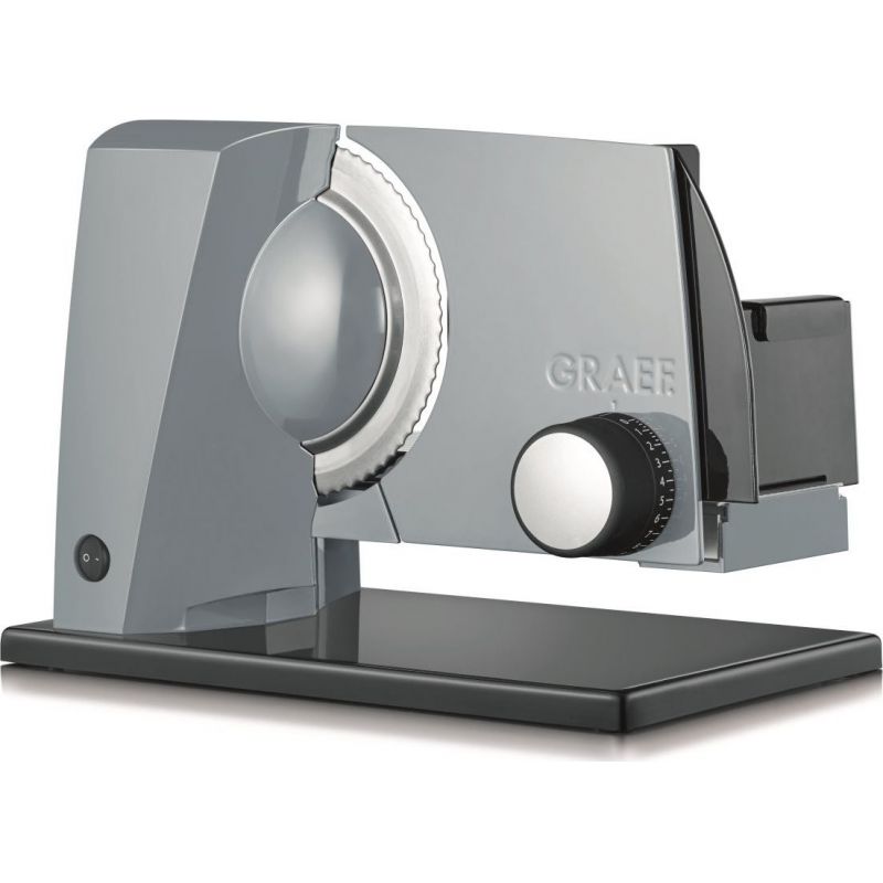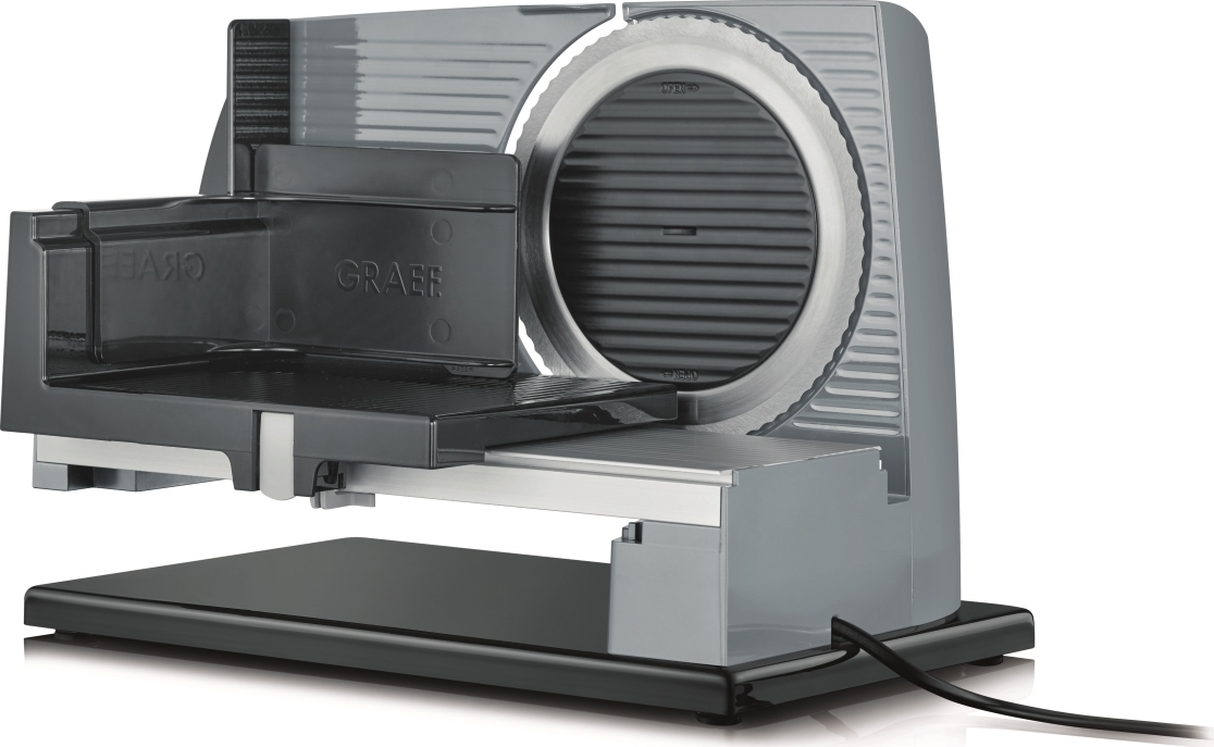 Elektrický kráječ GRAEF SKS 11000 zoubkovaný nerezový řezný kotouč o průměru 170 mm s bezpečnostním odnímatelným krytem zcela nová revoluční konstrukce kompaktní konstrukce, minimální nároky na místo vysoce stabilní provedení s opěrnou deskou plastový