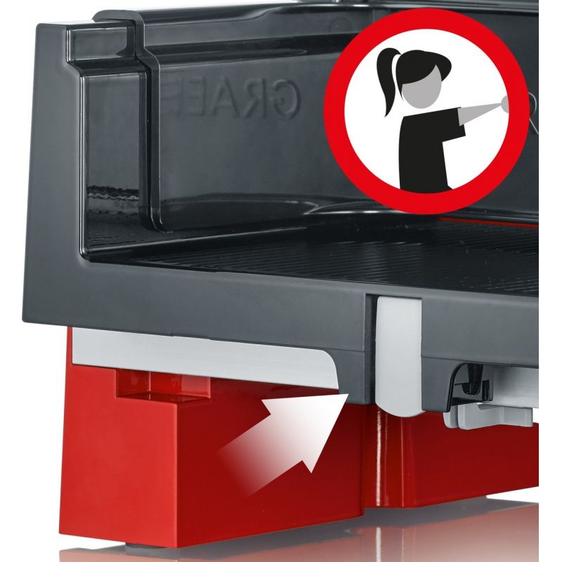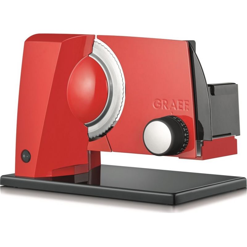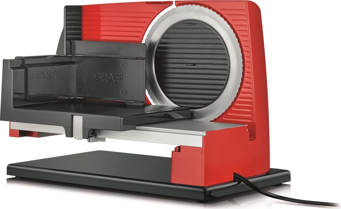 Elektrický kráječ GRAEF SKS 11003 zoubkovaný nerezový řezný kotouč o průměru 170 mm s bezpečnostním odnímatelným krytem zcela nová revoluční konstrukce kompaktní konstrukce, minimální nároky na místo vysoce stabilní provedení s opěrnou deskou plastový