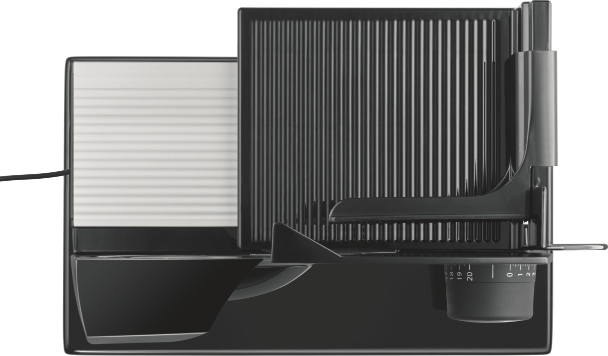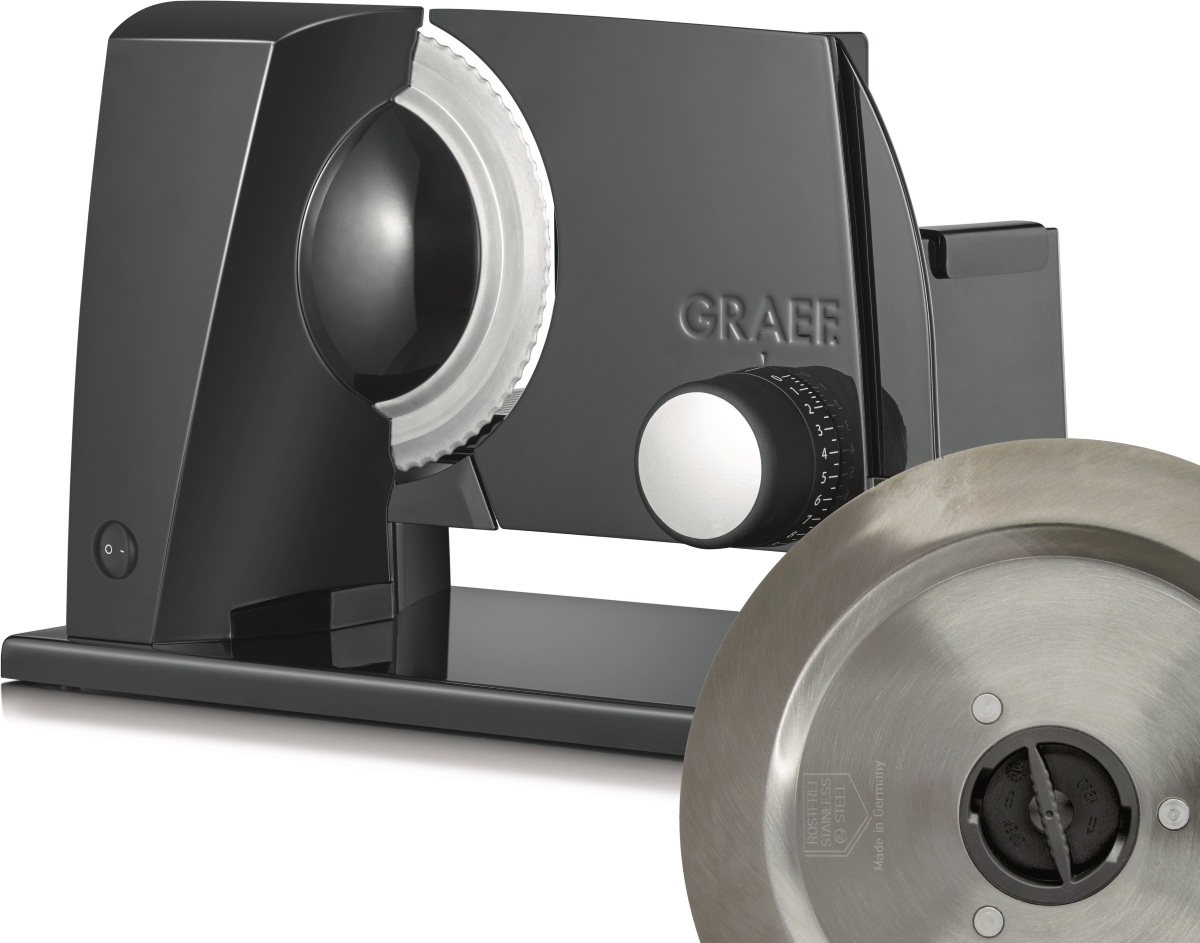 Elektrický kráječ GRAEF SKS 11022 zoubkovaný nerezový řezný kotouč o průměru 170 mm s bezpečnostním odnímatelným krytem zcela nová revoluční konstrukce kompaktní konstrukce, minimální nároky na místo vysoce stabilní provedení s opěrnou deskou plastový