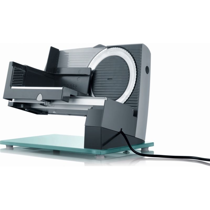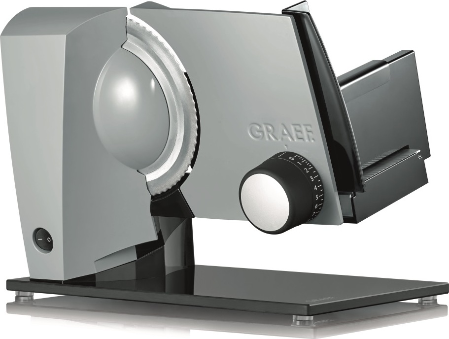 Elektrický kráječ GRAEF SKS 12100 zoubkovaný nerezový řezný kotouč o průměru 170 mm s bezpečnostním odnímatelným krytem zcela nová revoluční konstrukce kompaktní konstrukce, minimální nároky na místo vysoce stabilní provedení se skleněnou černou opěrno